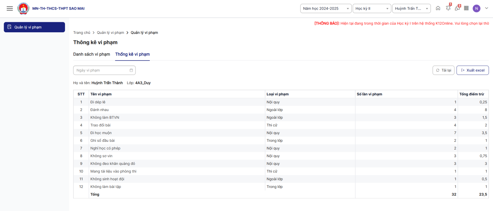 Bước 2: Phụ huynh học sinh có thể lọc theo thời gian để xem vi phạm theo thời gian cụ thể.