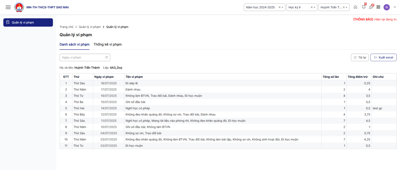 Bước 1: Vào Quản lý vi phạm => Màn hình hiển thị danh sách các vi phạm mà nhà trường/giáo viên gán cho con em mình.